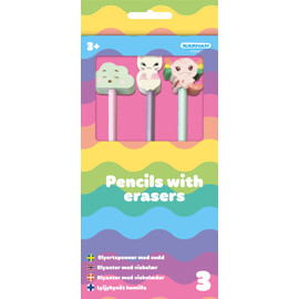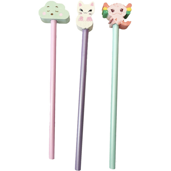 Et fint sett med tre blyanter med søte viskelær. Blyantene kommer uslipte i herlige pastellfarger og er pyntet med søte viskelær i form av en sky, en katt og en axolotl.