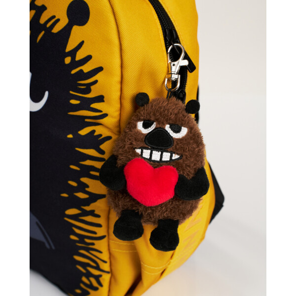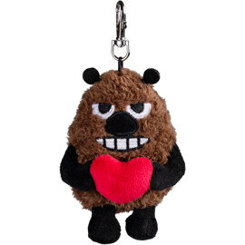 En veske-dekorasjon eller myk nøkkelring fra Mummi, med Stinky som holder en liten hjertepute i armene.