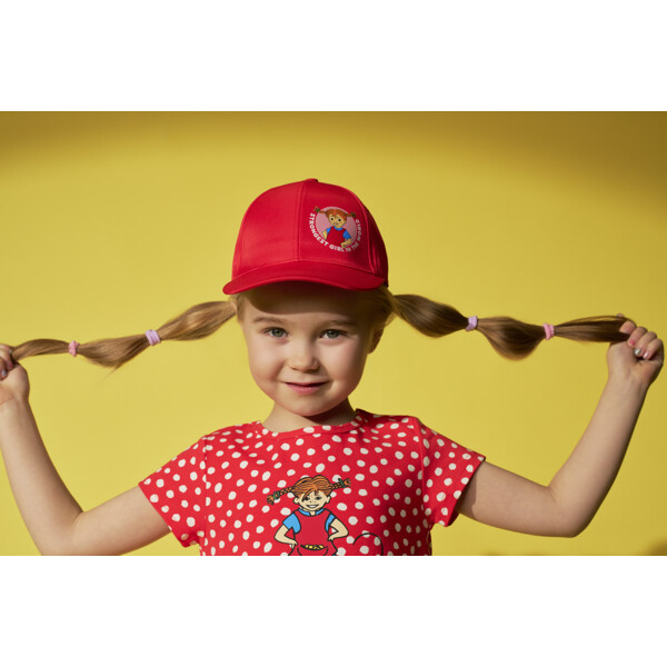 En klassisk Pippi caps for barn. Med forbøyd skjerm, solid front og et justerbart borrelåsbånd bak. Laget av sertifisert resirkulert polyester.