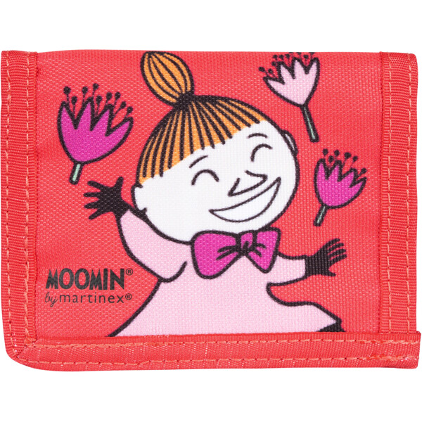 En fargerik Mummi lommebok i solid polyestercanvas, med glade Lille My og blomster. Glidelåslomme for mynter og rom for ID-kort og sedler. Lukkes med borrelås.