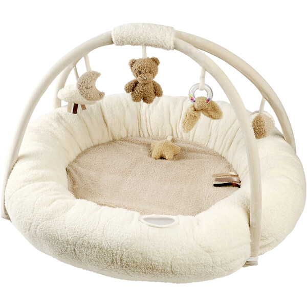 Nattou lekematte med bue er en myk, plysjaktig lekeplass der barnet ditt føler seg trygt og komfortabelt. Den tykke vatterte kanten og lekebuen med plysjleker, rangler, speil og andre tilbehør inviterer barnet ditt til å gripe, utforske og leke. Griperefleksene og de sensoriske ferdighetene stimuleres gjennom lek, mens barnet ditt også kan slappe av på den myke matten. Buen er avtakbar, så matten kan også brukes alene.ProdukspesifikasjonerBabylekematte: 90 × 90 × 48 cm (L x B x H)Materiale: 100 % polyesterInkluderer vattert kant, avtakbare buer med plysjleker, rangler, speil og tilbehørVedlikehold: matten kan vaskes i maskin på 30 °C, buer avtakbare med spenne (tørketromles ikke)