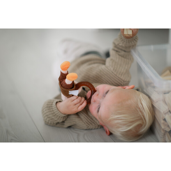 Med sin innebygde ring av naturgummi er den perfekt å gripe for små hender og behagelig å tygge på når tenner er på vei. Laget i trygge materialer, fri for skadelige stoffer og er en fin kombinasjon av koseklut og biteleke i ett.