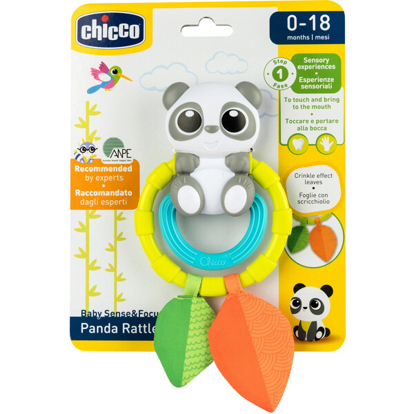 Panda-rangle med tekstil- og plastaktiviteter.To ringer: den største roterer rundt pandaen og skaper en morsom bevegelse, mens den minste ringen er laget av myk plast, perfekt under barnets tannfrembrudd.