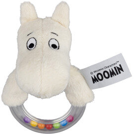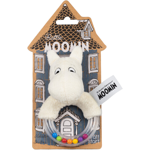 Lekent rangle med Mummitrollet. Perfekt for å oppmuntre finmotoriske og sensoriske ferdigheter. Lett å gripe og har en raslende lyd som stimulerer barnets hørselssans.