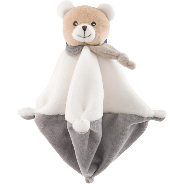 Myk velourbamse i form av en bjørn med beroligende koseklut.