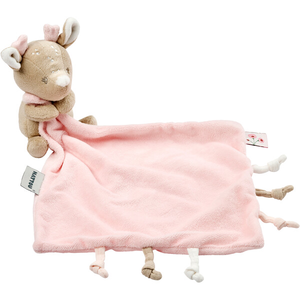 Dette myke babyteppet fra Nattou med et hjorteformet kosedyr vil bli ditt barns uatskillelige venn fra fødselen av. Den myke velouren gir en herlig kosete følelse og tilbyr trygghet selv for premature barn. Takket være sin lette vekt og mange gripealternativer kan små hender enkelt gripe dette kosete teppet, kose med det og ta det med overalt. Den lille hjorten gir komfort i vanskelige stunder og gir ro under lurene eller på farten. En fortryllende doudou som ikke bør mangle i barnets antrekk og er også en fantastisk babygave.Produkspesifikasjoner:Mykt koseteppe i form av en hjortSærlig egnet for nyfødte og premature barnMange gripealternativer, perfekt for små barnehenderMål: 38 x 16 x 48 cmMateriale: tetrabomull og myk velourLettstelt: maskinvaskbar på 30°C, skal ikke tørketromles
