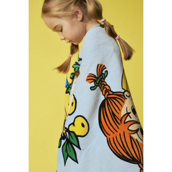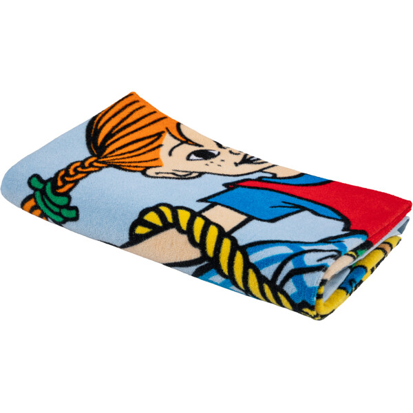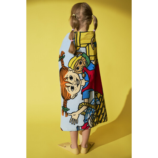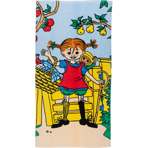 Pippi Langstrømpe Piknik Badehåndkle er et fargerikt badehåndkle med Pippi og Herr Nilsson som skal på piknik. Badehåndkleet er i myk bomullsvelur og har en innside av frotté med høy absorberingsevne.