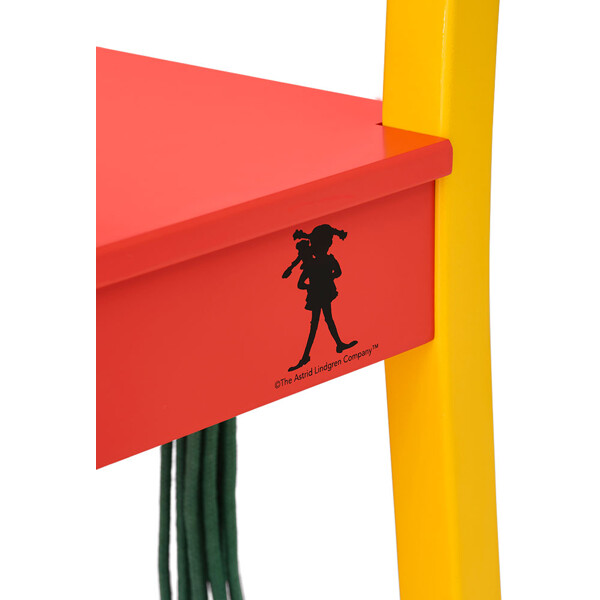 Stolen er laget av FSC-sertifisert tre og har på den ene siden av setet Pippis oppmuntrende ord trykket, mens den andre siden prydes av hennes velkjente silhuett — en hyllest til hennes dristige og selvstendige ånd. Ryggstøtten er dekorert med et lekent rutemønster, inspirert av illustrasjonene fra Pippis verden.