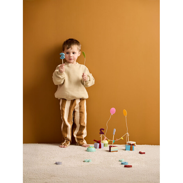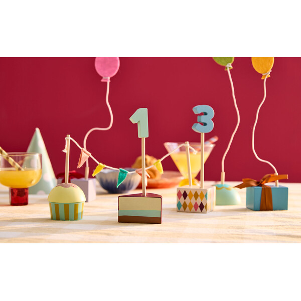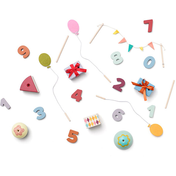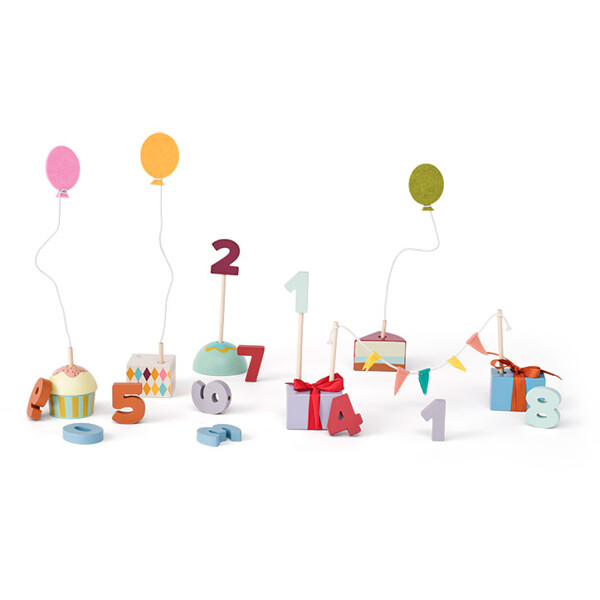 Hver figur har et nummer for å markere bursdagsbarnets alder. Settet kommer med tallene 0 til 9 samt et ekstra tall 1, noe som gjør at det kan brukes ved flere bursdager. To ballonger i filt på metalltråder gir en ekstra dekorativ detalj. En pappeske er også inkludert, der alle delene kan oppbevares og tas frem år etter år.