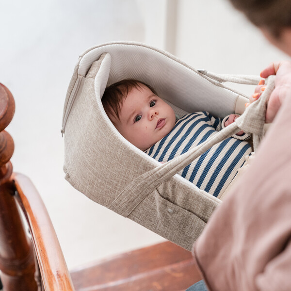 Med sin ergonomiske design, bærehåndtak og vannavvisende ytterstoff er den myke bærebaggen både lett å ta med og enkel å bruke i de fleste liggevogner eller på flate sittedeler ved hjelp av de medfølgende sikkerhetsremmene. Babyen din kan hvile trygt, uten å måtte vekkes ved flytting.