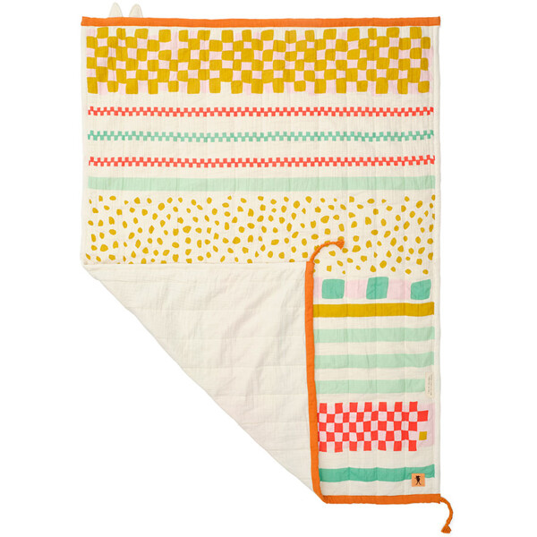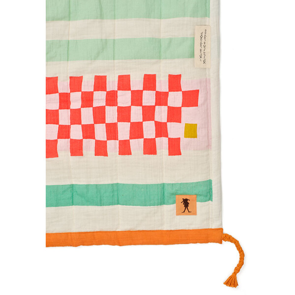 Teppet er sydd i lag-på-lag vevd bomullsmuslin – et lett og luftig stoff – med en tynn fylling av resirkulert polyester. Det gir passe varme ved hvile, leggetid eller når barnet vil krype opp i sofaen. Trykket på forsiden er basert på illustrasjoner fra Pippi Langstrømpe-bøkene. På baksiden finnes et påsydd tøystykke med sitatet – som en liten hilsen fra Pippi selv. I den ene enden sitter to tøyfletter og to tøyører – en liten hilsen til Pippi og hennes hest.