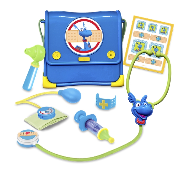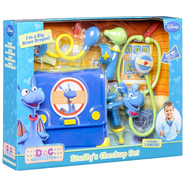 Doc McStuffins Stuffys Doktorveske er dragen Stuffys doktorveske og undersøkelsesett. Doc McStuffins er den populære serien fra Disney der Dottie vil være doktor akkurat som sin mamma. Når Dottie tar på seg stetoskopet sitt våkner lekene og kosedyrene til liv og Dottie kan hjelpe dem med å føle seg bedre. Hjelp doktor McStuffins med hennes pasienter. Undersøkelsesettet inneholder Fuffes (Stuffy the dragon) veske, stetoskop med lampe og lyd, blodtrykksmansjett, otoskop, sprøyte, lekebandasje og klistremerker.