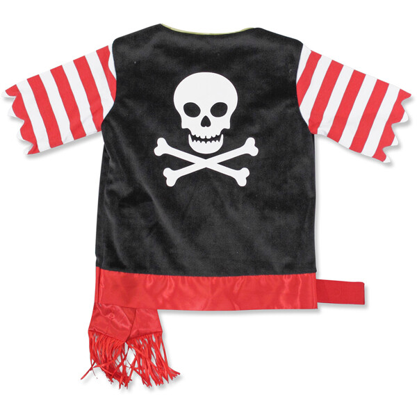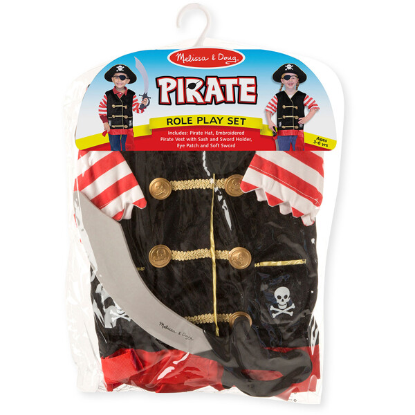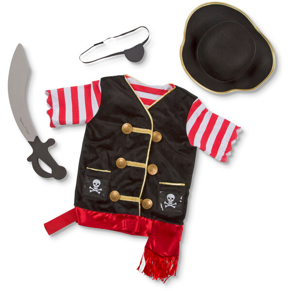 Settet inneholder en brodert vest med gyldne detaljer, dype lommer for skatter og et påsydd silkebånd i rødt. Piratutseendet fullendes av en pirathatt i filt, en ikonisk øyelapp og et mykt sverd. Drakten er designet for å passe barn i alderen tre til seks år og er laget av høykvalitetsstoffer og har en solid konstruksjon for holdbarhet, noe som muliggjør gjentatt bruk.