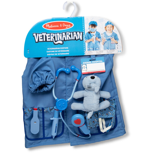 Med dette kostymesettet for veterinærrollespill kan barn engasjere seg i fantasifull lek når de tar seg av sine lekedyr.Settet inneholder en maskinvaskbar blå jakke, maske og kirurglue samt viktige tilbehør som et stetoskop med lydeffekter, sprøyte, termometer, bandasje og en gjenbrukbar navneskilt for veterinærer. En myk pasientvalp følger også med som barna kan "doktorere" og elske.