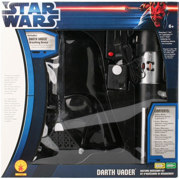 Sett med kappe, maske, lyssverd og ""stemmeforvrengingsapparat"". Apparatet festes på innsiden av masken og får deg til å høres ut som Darth Vader!