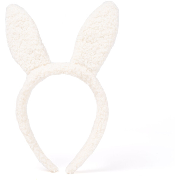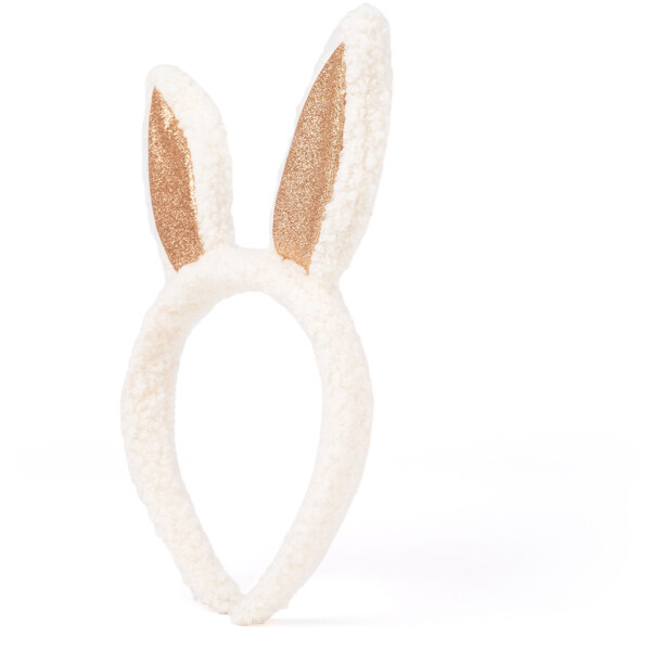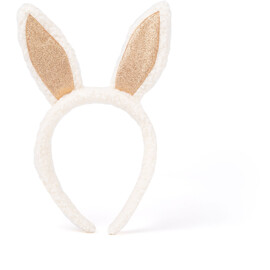 Mykt diadem med hvite kaninører og glitrende gulldetaljer.