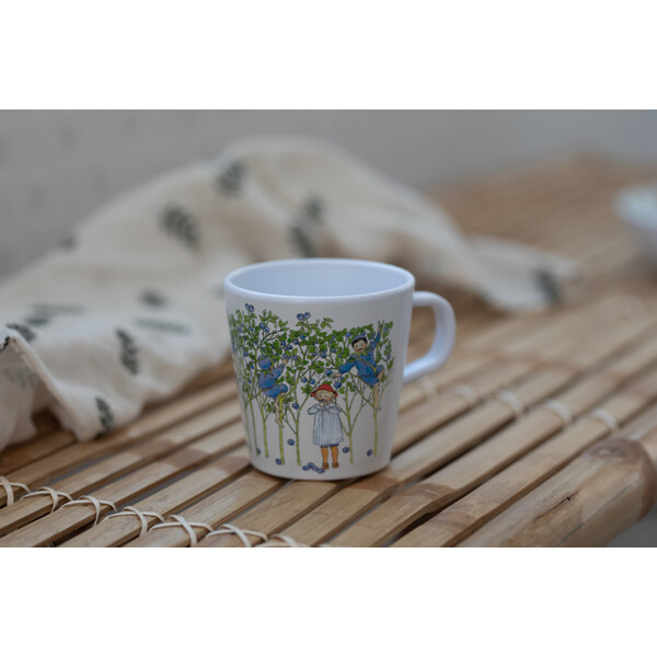 Denne koppen med håndtak har motiv fra Elsa Beskows bok om Puttes eventyr i Blåbærskogen.