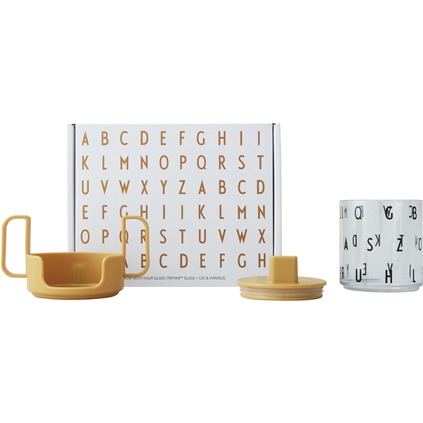 Design Letters Grow With Your Glass Beige kan brukes fra litt mindre barn til eldre takket være det smarte tilbehøret som følger med. Bruk glasset sammen med håndtaket og det smarte rørlokket og fjern dem etter hvert som barnet vokser. Glasset er laget av tritan og har et mønster av bokstaver. Glasset er fritt for BPA og BPS.