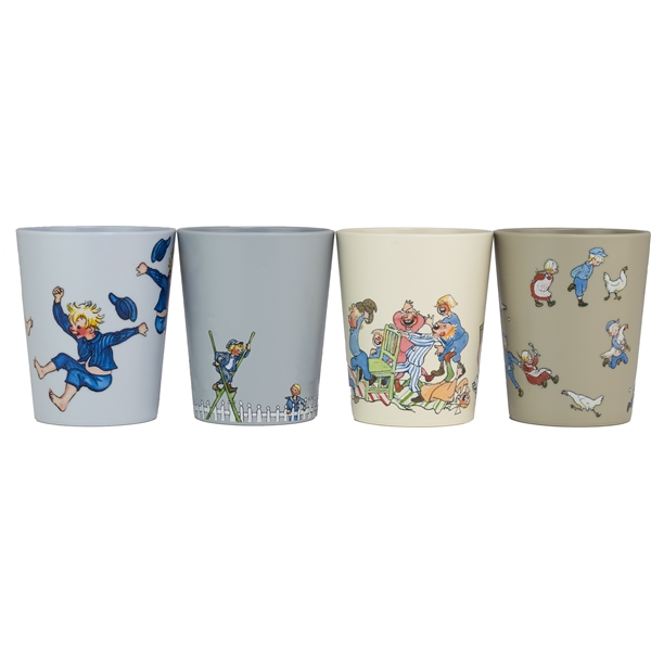 Fire fine samlerkrus med Emil fra Lønneberget-motiv, laget i RPET, som er et miljøvennlig og slitesterkt materiale.