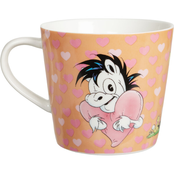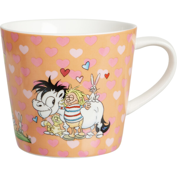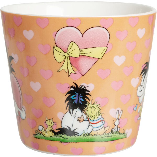 En hvit porselenskrus i solid størrelse som rommer 3,5 dl. Utsiden av kruset er hel-dekorert med Lena Furbergs søte Hesten Mulle-motiv, der Mulle tilbringer tid med sine beste venner. I bakgrunnen finnes små hjerter i ulike nyanser av rosa.