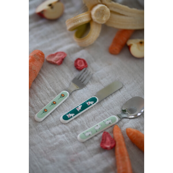 Kniv, gaffel og skje som passer små hender og munner. Leveres i en fin og praktisk gaveeske.