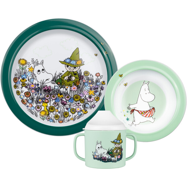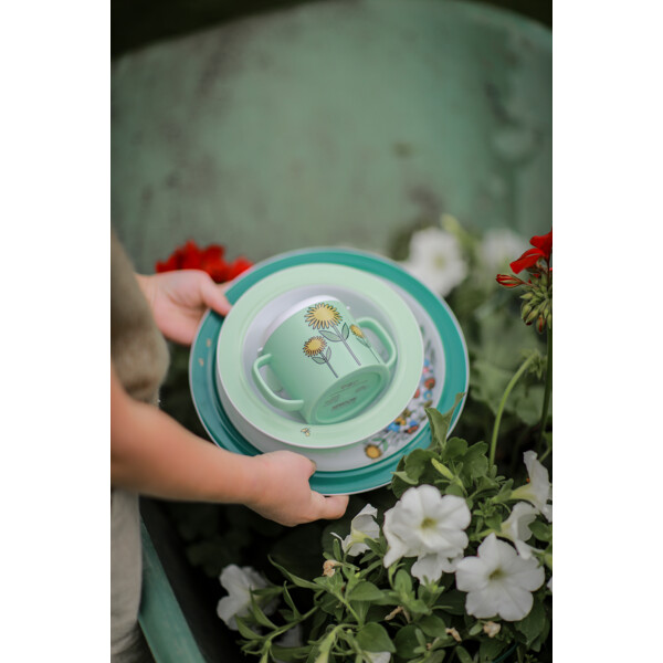 Inneholder en tutekopp med to håndtak der lokket sitter ordentlig med hjelp av en silikonring. I tuten finnes det en sølestopp som begrenser flyten. Når barnet blir eldre kan ventilen fjernes. Sett har også en dyp og en flat tallerken med silikonring under som gjør at de står stødig på bordet.