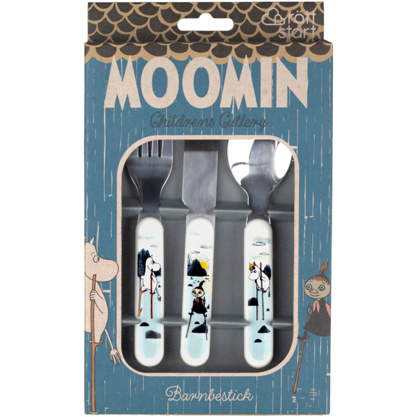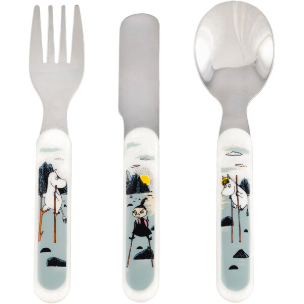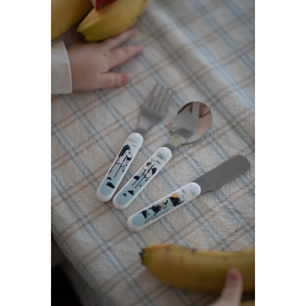 Slitesterkt barnebestikk i ABS-plast og rustfritt stål. Kniv, gaffel og skje som passer små hender og munner.