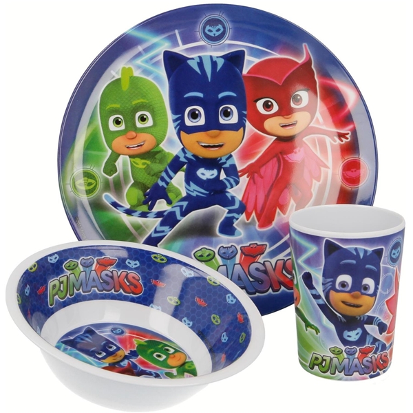 PJ Mask Melamine Set er et servise med PJ Masks på som gjør måltidet litt morsommere for barnet. Servisene består av en tallerken, en bolle og et krus som er laget av hard plast. Bruk serviset hjemme eller ta det med på ekskursjon, servisets glade farger og fine motiver gir ekstra matglede.