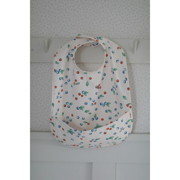 Beskytter klær fra smuss og søl. Lommen foran samler opp maten som ellers kanskje ville havnet på gulvet. Den festes enkelt med en borrelås i nakken.