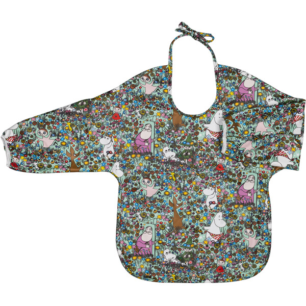 Praktisk smekke med ermer som kan brukes både ved mat og lek med Mummi-motiv.