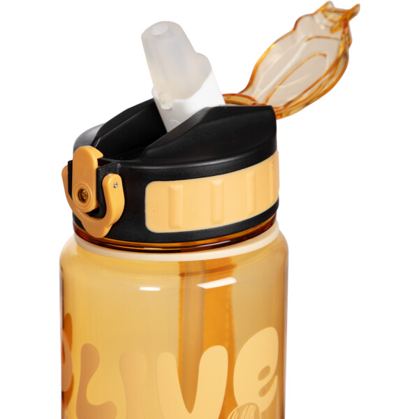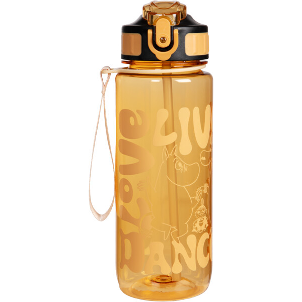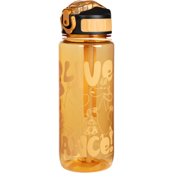Flasken har en bærerem, et tett lokk og et smidig sugerør som felles inn under et lite lokk, med en behagelig myk drikkedel. Den er komfortabel å drikke av, lett å rengjøre og enkel å ta med seg. På flasken er det et bilde av mummifigurer og teksten 'Live, Love, Dance'.