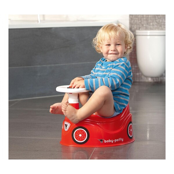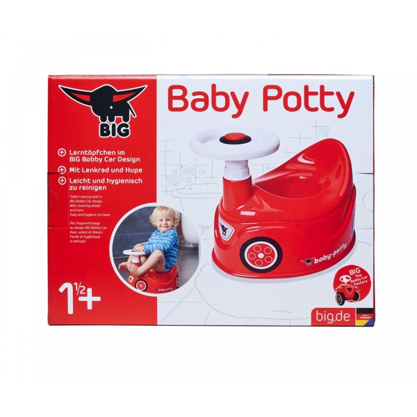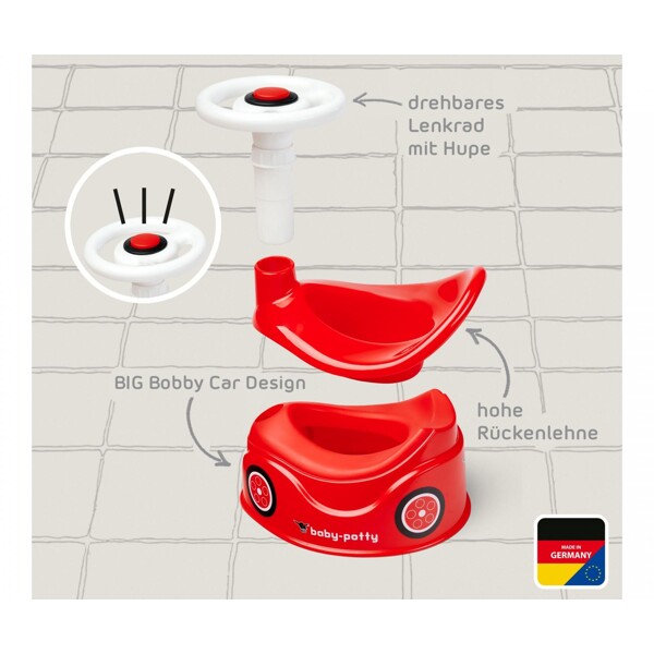 Fra nå av kan pottetreningen være avslappet og stressfri med BIG-Baby-Potty - fordi den morsomme potten som er integrert i BIG-Bobby-Car-designen gjør pottetreningen morsom også. Med sin likhet med den populære BIG-Bobby-Car-Classic har den røde potten med dreibar ratt en nesten magisk tiltrekningskraft på små barn. Det barnevennlige setet med høy ryggstøtte gjør selv de lengste treningsøktene komfortable og avslappede.
