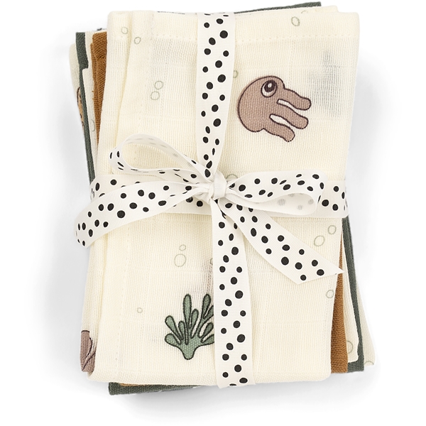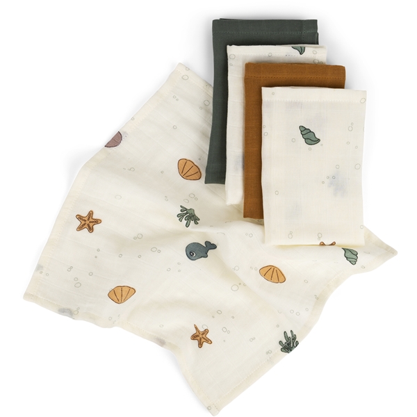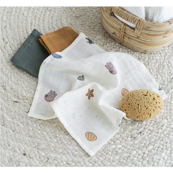 Done By Deer Wash Cloth Sea friends 5-pack er et sett med praktiske vaskekluter i en blanding av solid farge og et søtt Sea Friends-trykk. I tillegg til å bruke disse til å vaske babyen din, er de perfekte for måltider, bleieskift eller på farten.