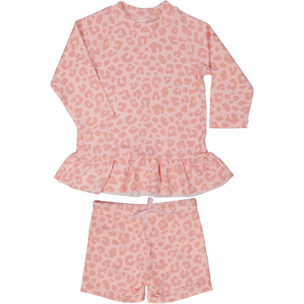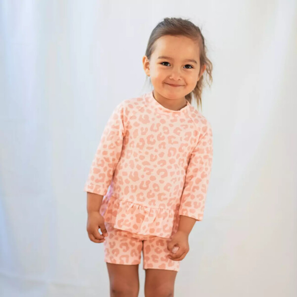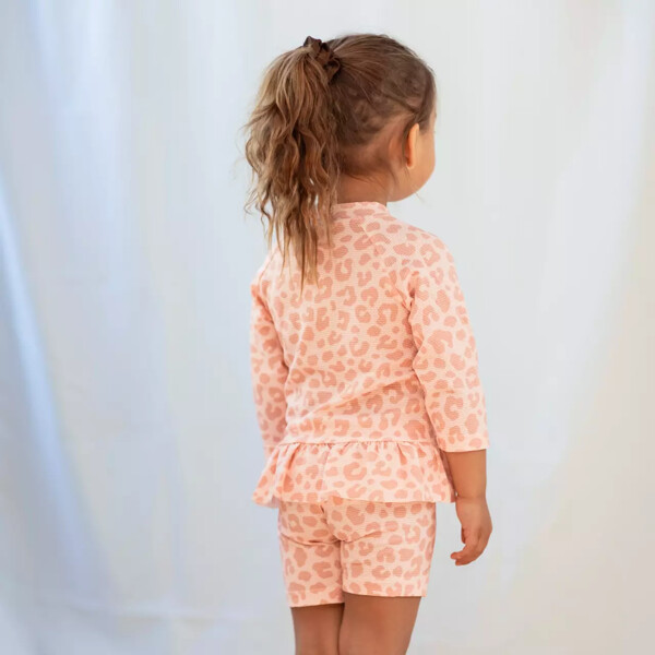 Rosa UV bad-set med kortermet trøye og shorts. Det er laget i et hurtigtørkende materiale, med UV-50+ som blokkerer 98% av solens farlige UVA- og UVB-stråler. En storfavoritt hos barnefamilier. Med et UV-sett beskytter du barnet ditt mot solens sterke stråler. Trøyen har en glidelås foran for enkel på- og avkledning.