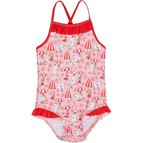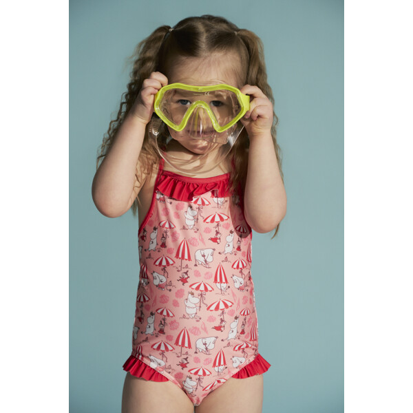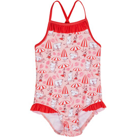 En søt Mummi badedrakt for barn. Badedrakten er fôret foran og har kryssede skulderstropper og små volangdetaljer i øvre kant og ved bena. Laget av elastisk, hurtigtørkende polyesterblanding.