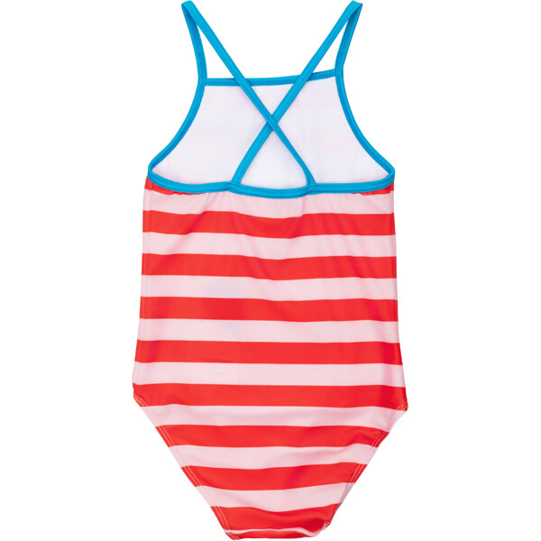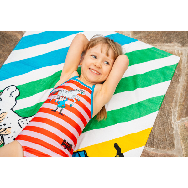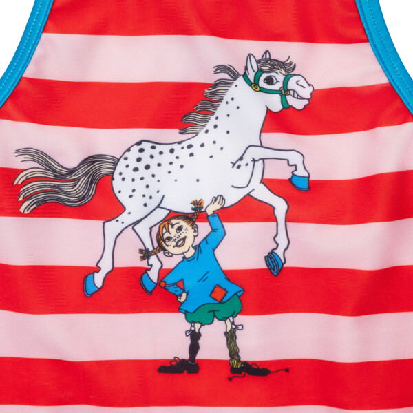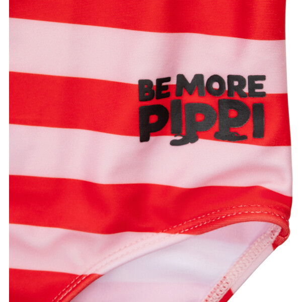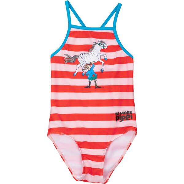 En morsom stripete Pippi badedrakt for barn. Badedrakten er foret foran, den er høy i ryggen, og de tynne, kryssede skulderstroppene glir ikke ned over skuldrene. Laget av elastisk, hurtigtørkende polyesterblanding.