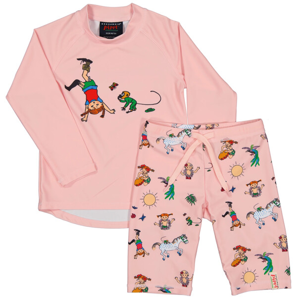 UV-sett med Pippi-motiv fra Geggamoja. Trøye med lange ermer og bukse med korte ben. Buksen har strikk i midjen.