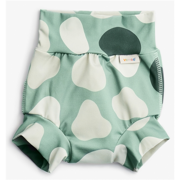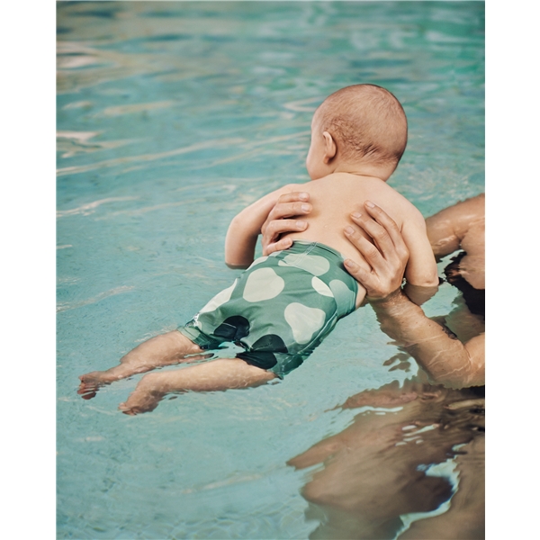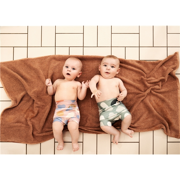 For de aller minste er denne søte badebleien med høy midje og mansjetter i enden av bena ekstra god. Den er behagelig og beskytter mot lekkasje da bleien dekker et godt stykke oppover babyens rygg og rundt lårene. Det er ikke behov for en ekstra bleie eller innlegg under svømmebleien. Skyll badebuksene etter bruk.
