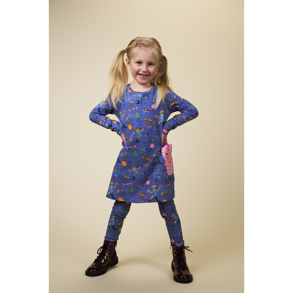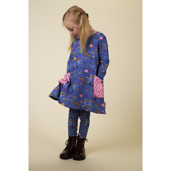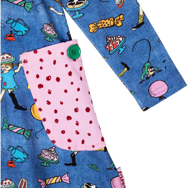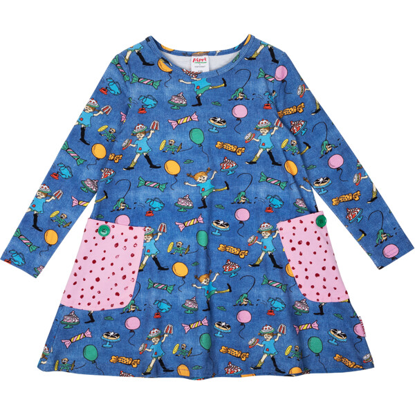 En myk og behagelig Pippi Langstrømpe-kjole for barn, i herlig denimblått med festlig mønster. Den A-linjeformede kjolen har lange ermer, en rund halsringning og påsydde lommer med dekorasjonsknapper i skjørtedelen. Produktet inneholder sertifisert økologisk bomull.