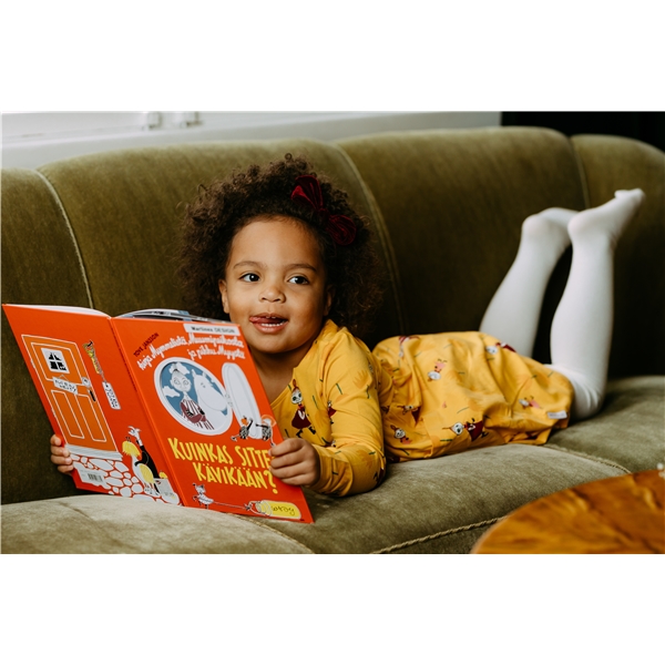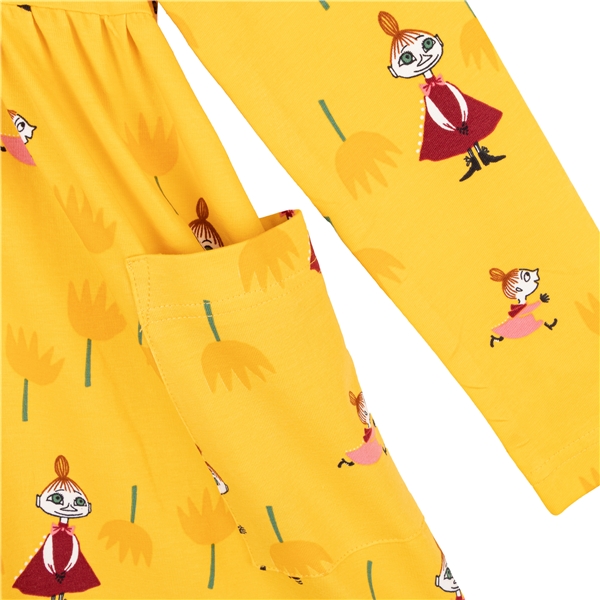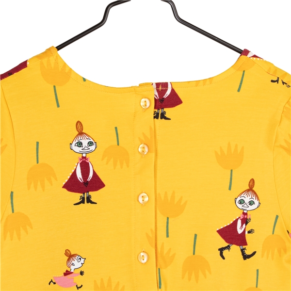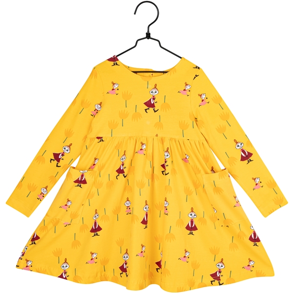 Mummi-tulipankjole Gul er en langermet kjole med Lille My og Mymlan blant store tulipaner. Kjolen har knapper bak og påsydde lommer foran.