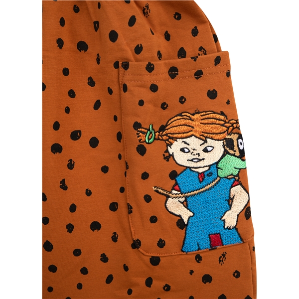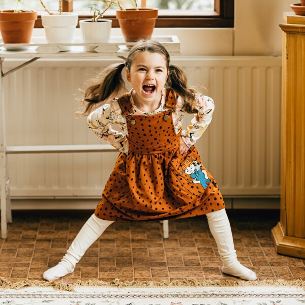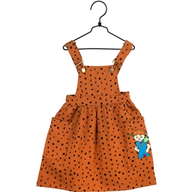 En myk og behagelig grimekjole i genserkvalitet med børstet innside. Kjolen er sort prikkete og den har påsydde lommer foran. Den ene lommen er dekorert med et Pippi Langstrømpebroderi. Midjen er elastisk og de justerbare selene krysser ryggen, og holder dem perfekt på plass.