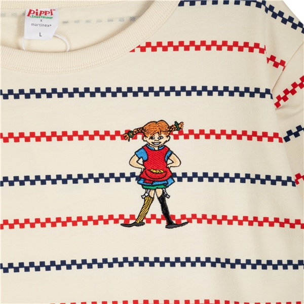 En myk og koselig Pippi Langstrømpe collegekjole for barn. Lang erm med lett nedfalte skuldersømmer, mansjetter i ermesluttene, rund halsringning, fine røde og blå striper mot det benhvite, samt et fargerikt Pippi-trykk foran. Kjolen er avskåret med innfelt strikk og rynker i midjen. Produktet inneholder sertifisert økologisk bomull.