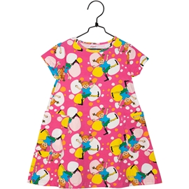 En fargerik Pippi sommerkjole til barn. Kjolen i A-linje har korte ermer og to lappede lommer nederst. Kjolen er laget med GOTS-sertifisert økologisk bomullsblanding.