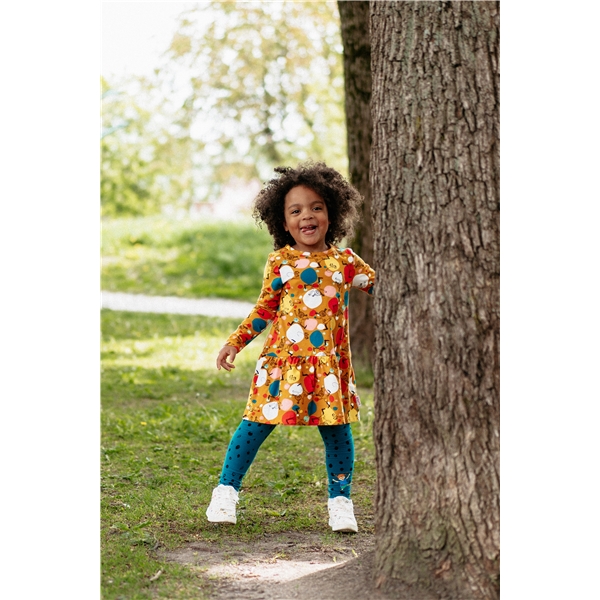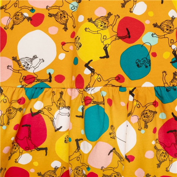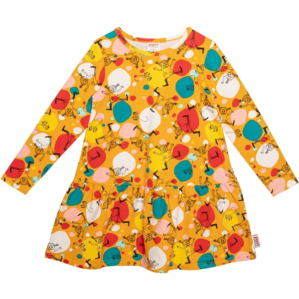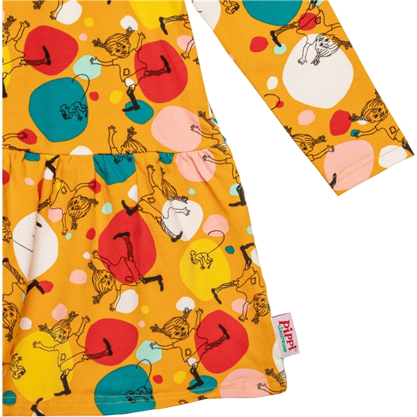 En langermet kjole i matt oransje, helmønstret med Pippi Langstrømpe som spinner blant kuler i morsomme farger. Kjolen er A-formet med skjørtdelen som en fin volang. Økologisk bomullsblanding.
