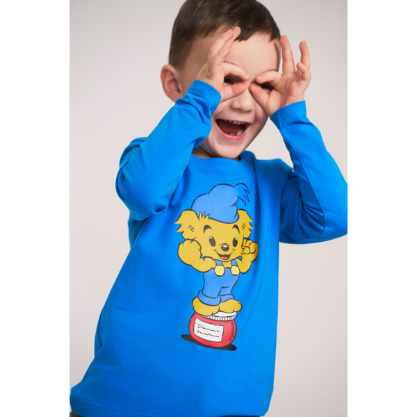 En myk og komfortabel Bamse-genser for barn. I rett modell med lange ermer, rund halsringning og morsomt trykk foran. Produktet inneholder sertifisert økologisk bomull.