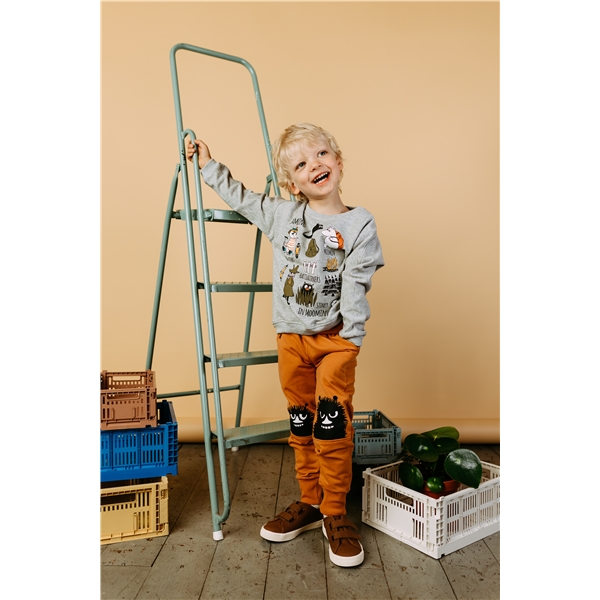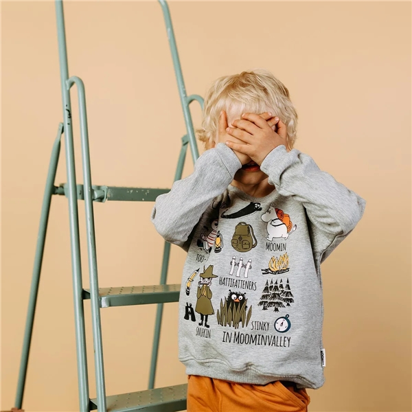 Moomin College Sweater Grey er en myk og behagelig Mummigenser i oversize. Genseren har en rund hals og et trykt mønster med ulike mummikarakterer i campingtema.