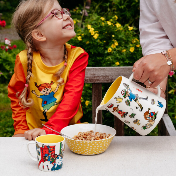 Happy Pippi Sweater Yellow er en fargerik, leken Pippi-genser med lange ermer og rund hals. Genseren er oransje, rød og gul har Pippi-trykk foran.