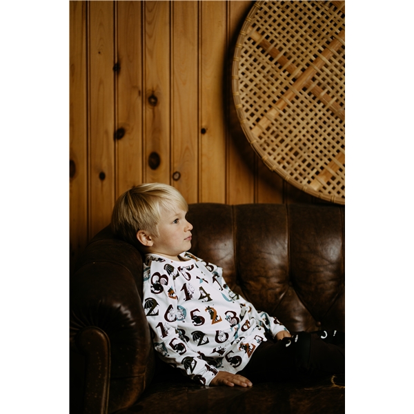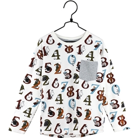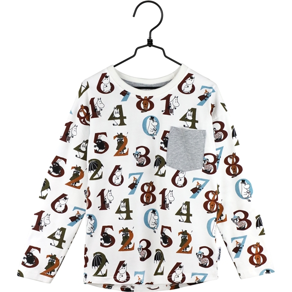 Mummi Numre Trøye Kitt er en nydelig langermet skjorte med et lekent mønster av tall og mummikarakterer. Skjorten har en grå brystlomme som en tøff detalj.