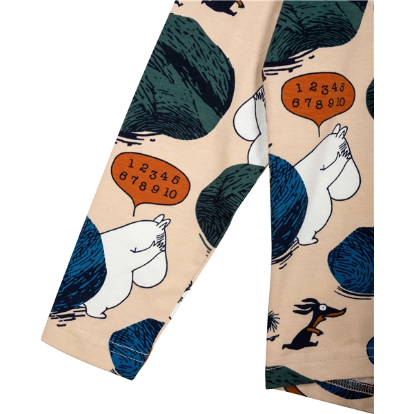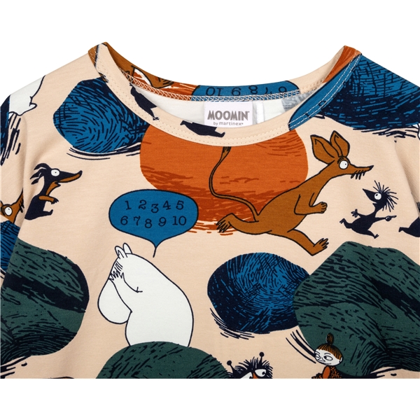 En langermet skjorte i beige, helmønstret med mummifigurer som leker gjemsel og teller til ti blant store steinblokker. Modellen er litt oversized med avsmalnende skuldersøm og pent avrundet nederkant.