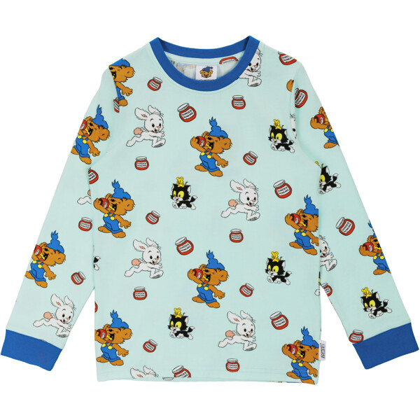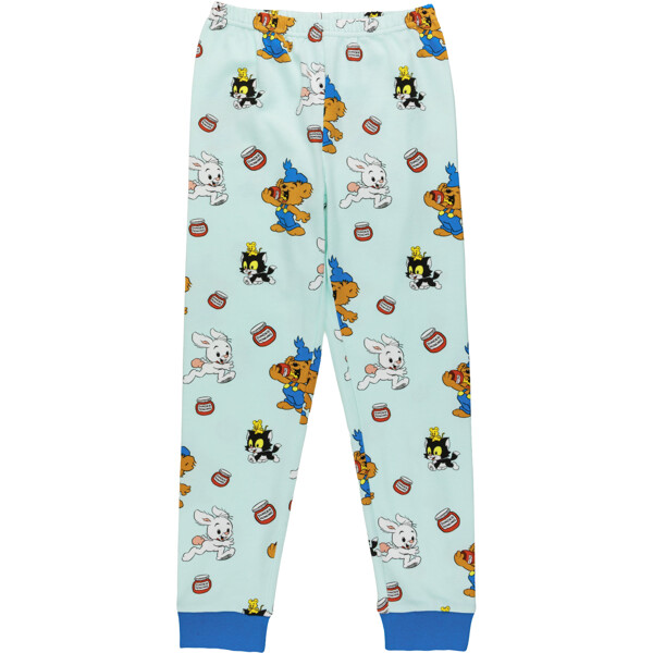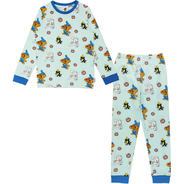 En todelt Bamse-pysjamas for barn. Med lange ermer og rund halsringning. Buksen har innfelt strikk i midjen. Produktet inneholder sertifisert økologisk bomull.
